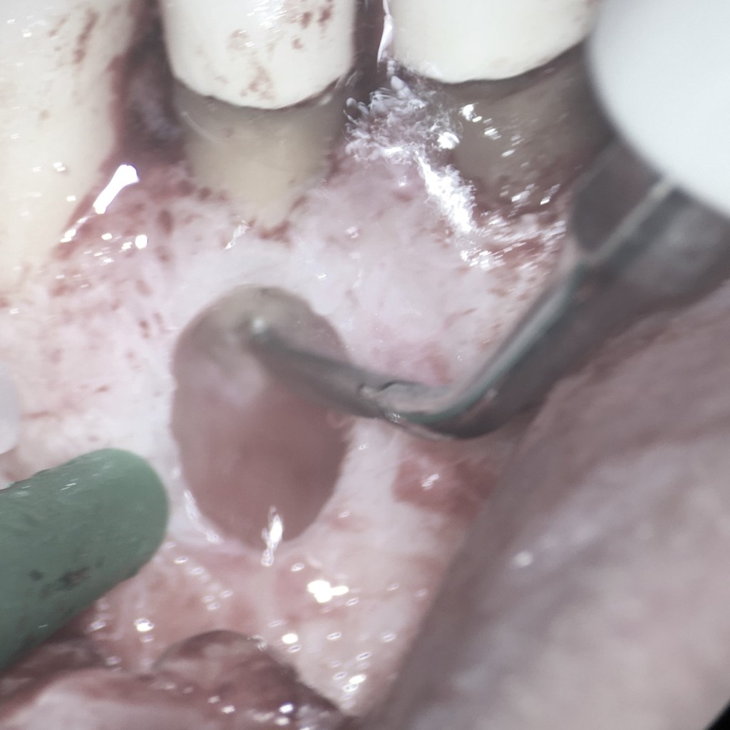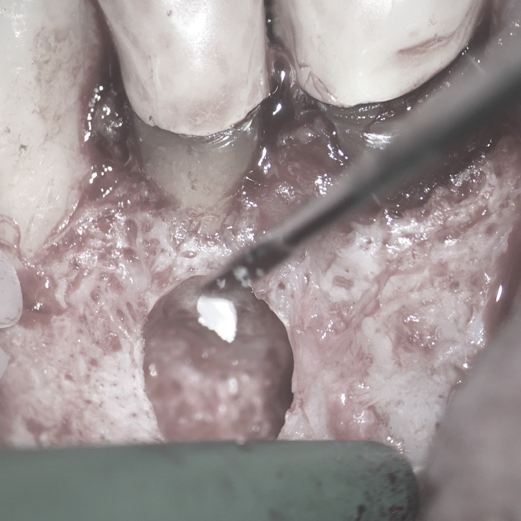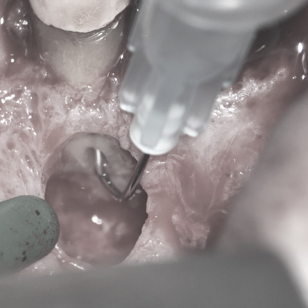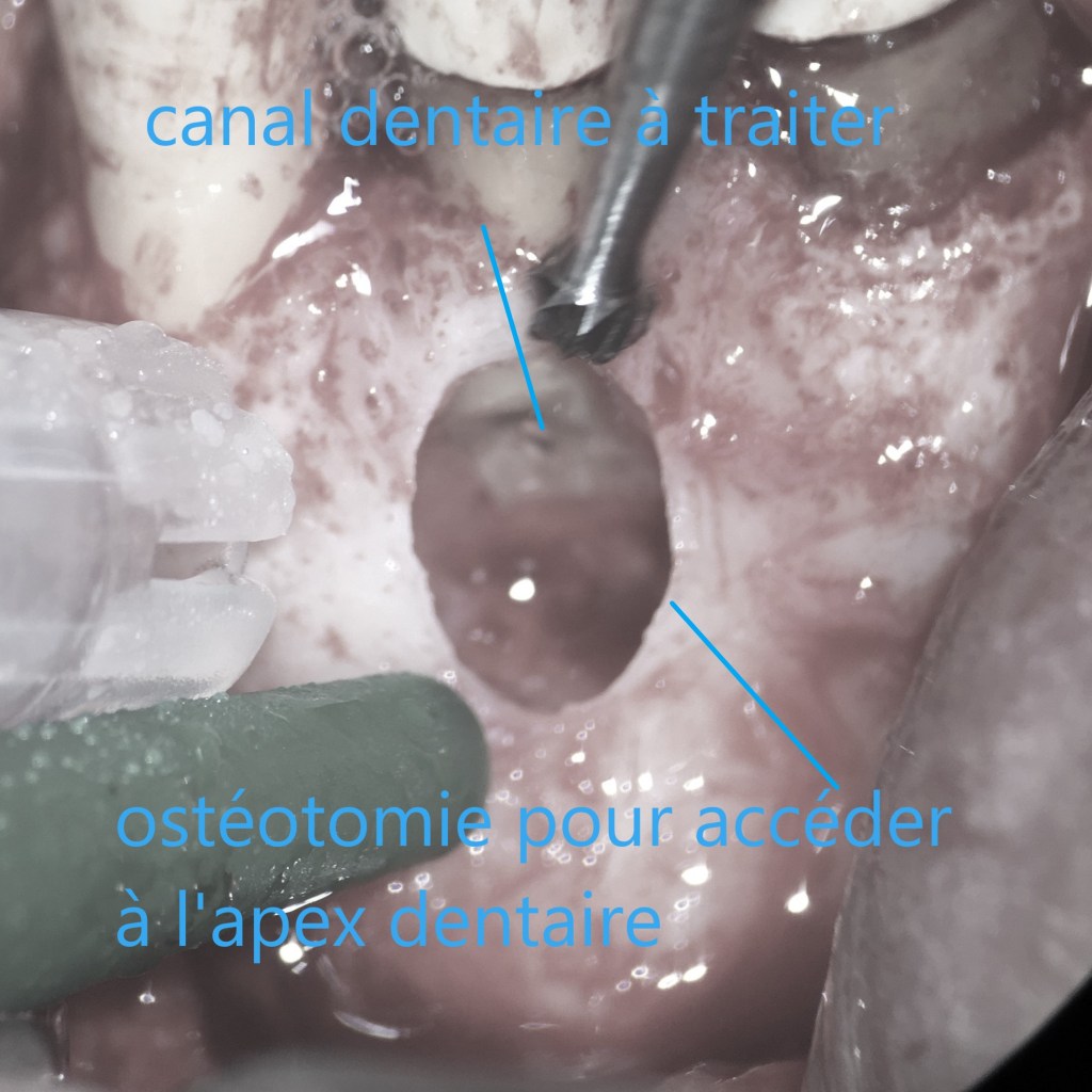 - L’apex de la dent est dégagé puis réséqué sur quelques millimètres. La lésion osseuse est curetée.